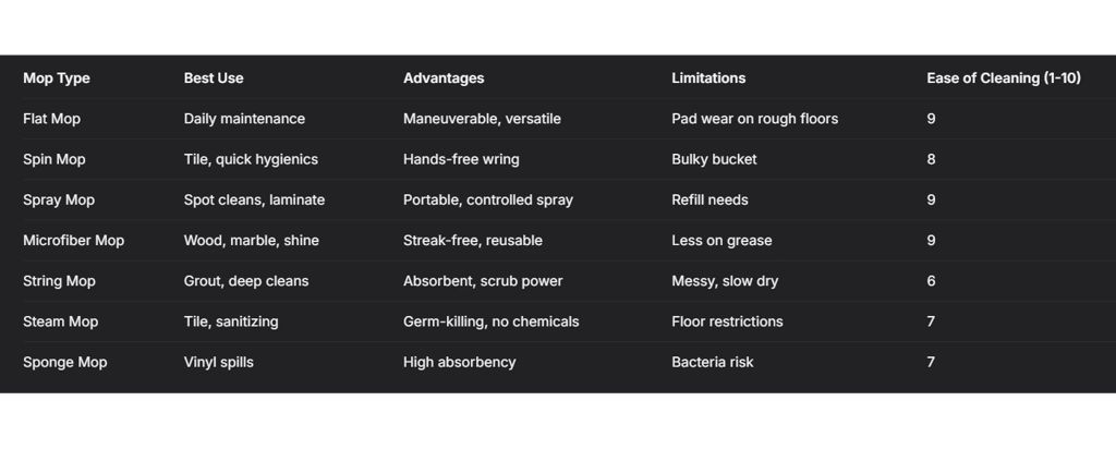 Understanding types of mops is crucial for matching tools to tasks. Each design offers unique mechanisms for dirt removal, water management, and ease of use. Below are detailed explanations with balanced pros and cons, drawn from lab tests by Consumer Reports and user studies.